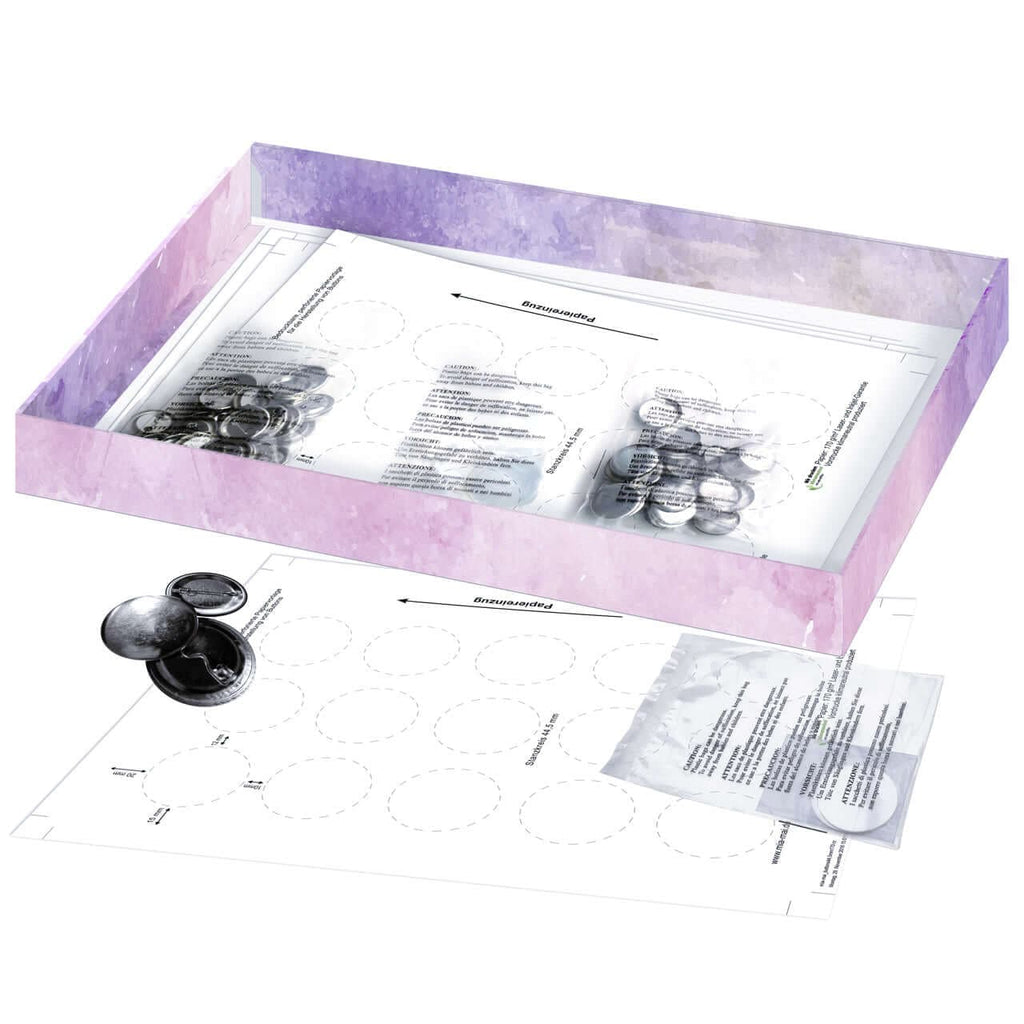 Es handelt sich um Buttonrohlinge Komplettsets verpackt in einer ansprechend gestalteten Schachtel. Jedes Button Set besteht aus Metall-Oberteil, Metall-Unterteil mit eingelegter Sicherheitsnadel, Klarsicht-Folie und bedruckbarem Buttonpapier.